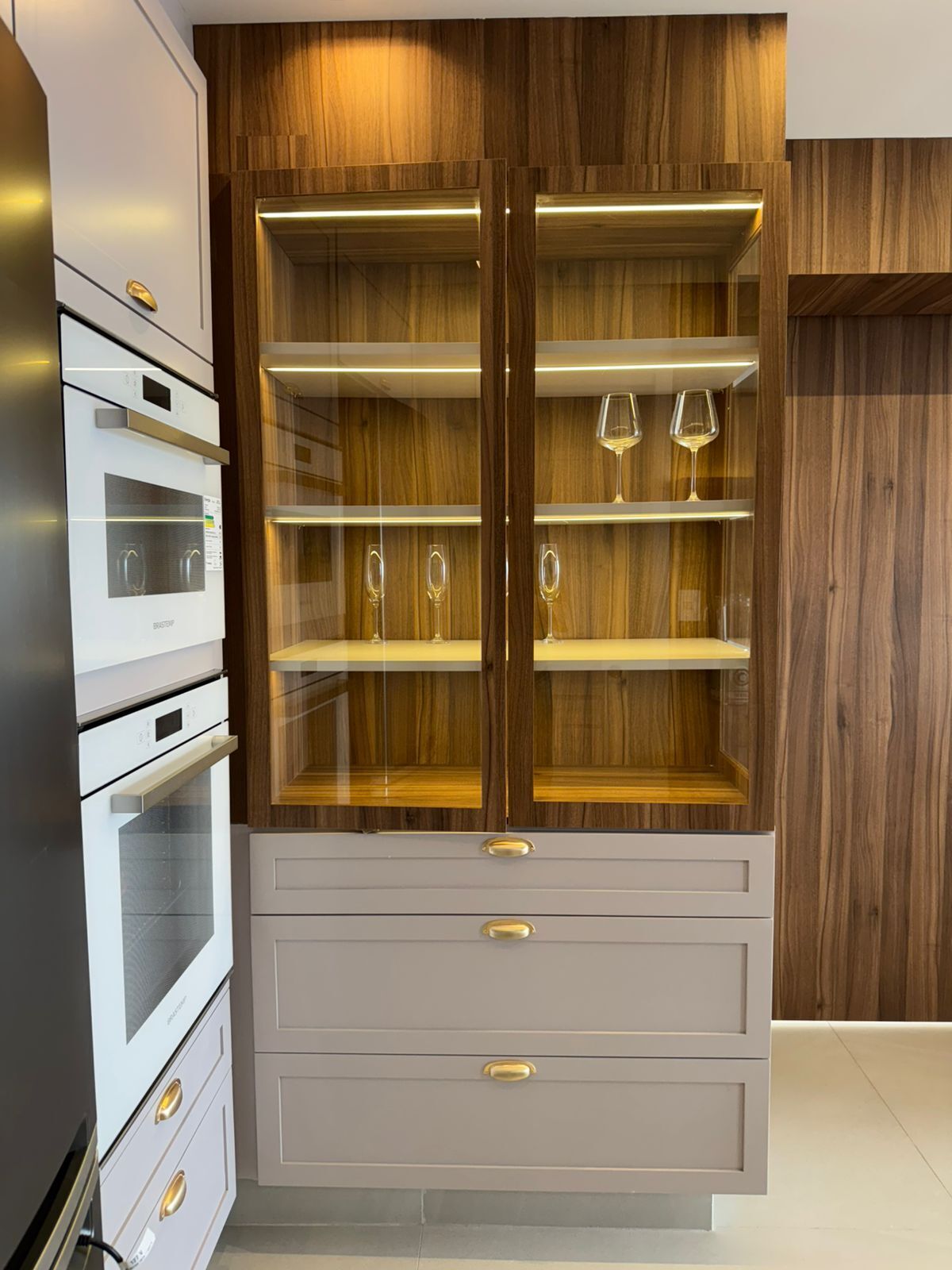 - Cozinha moderna com armários planejados, iluminação em LED, cooktop e adega