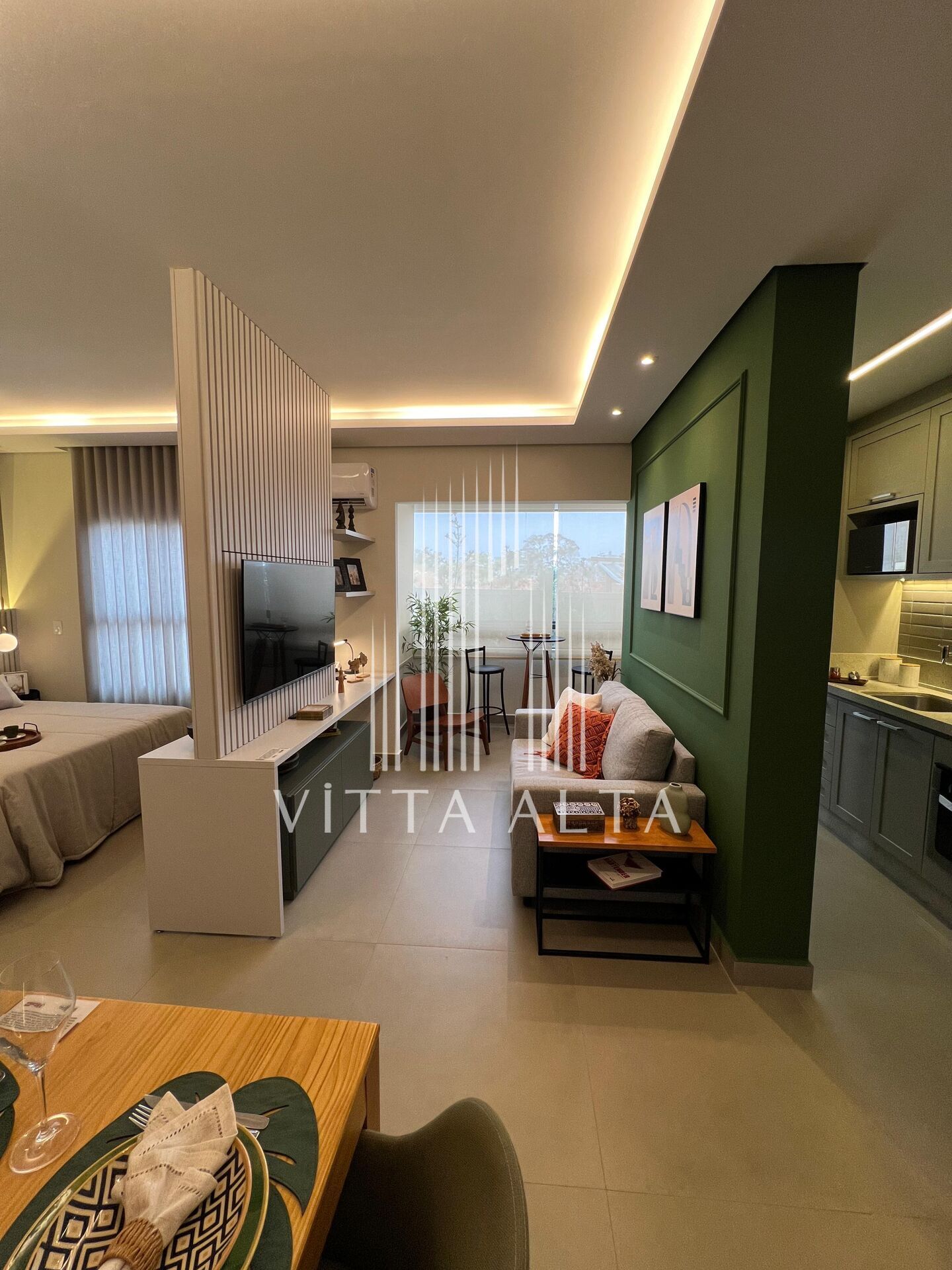 Studio de 40m² com sala de estar/jantar, cozinha, 1 dormitório, banheiro e varanda.
