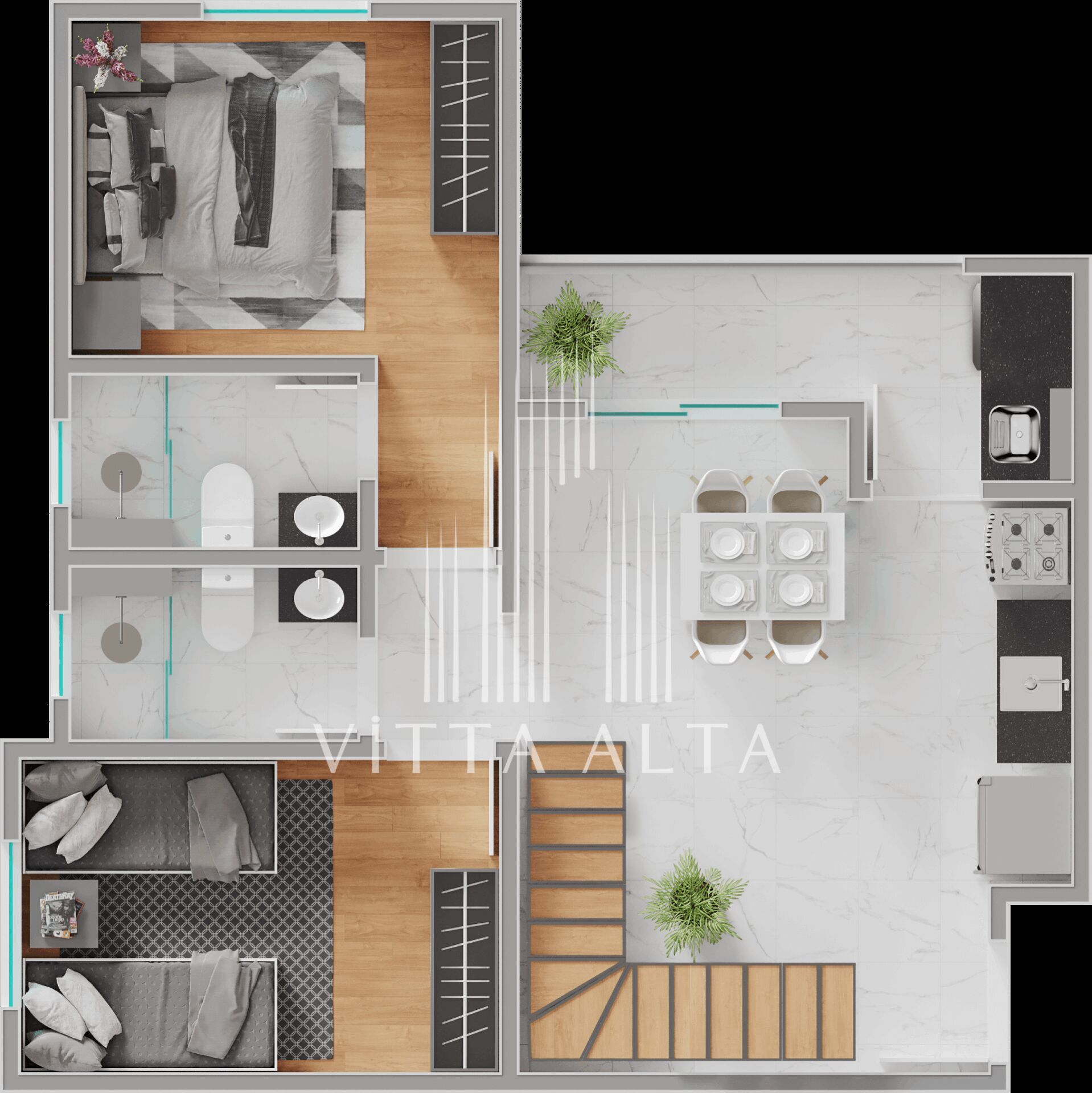 - Acabamentos de alto padrão, com piso porcelanato na sala, cozinha, banheiros e circulação, e piso laminado nos dormitórios.