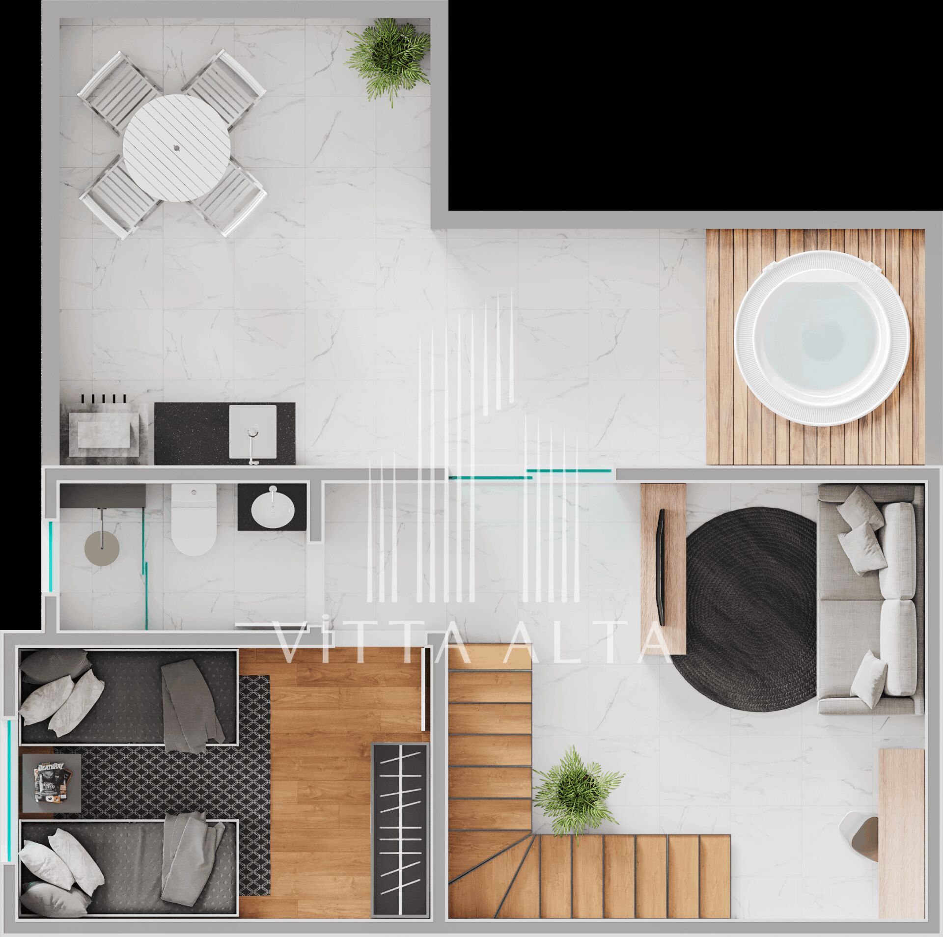 - Banheiro completo, com acabamentos iguais aos do primeiro pavimento.