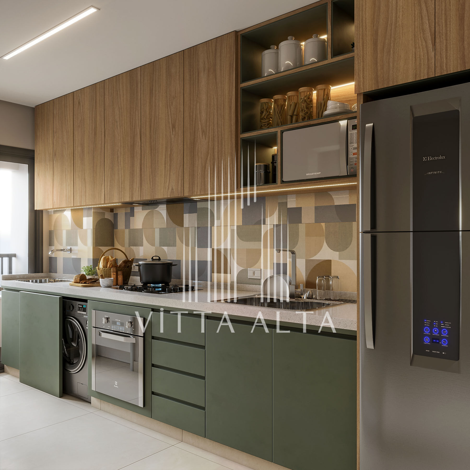 Integrada à cozinha, conta com piso em porcelanato 60x60cm e revestimento cerâmico na parede do tanque até 1,50m. As outras superfícies mantêm o padrão de pintura látex branca, criando continuidade visual entre os ambientes.