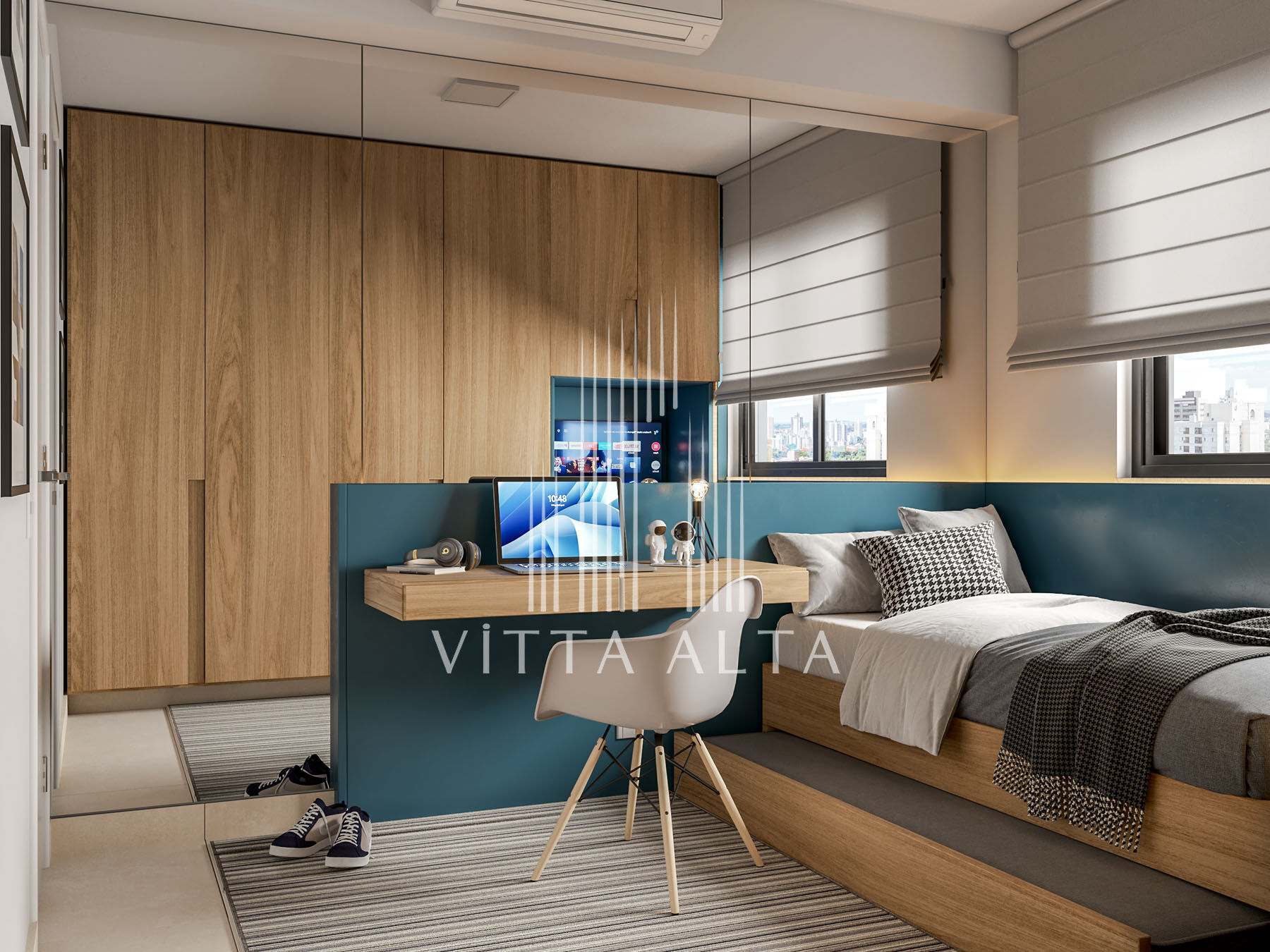 Esta configuração inclui duas suítes privativas e um ambiente reservado para home TV ou escritório. Os quartos possuem piso laminado de madeira, proporcionando conforto térmico e acústico. As paredes e tetos são finalizados com pintura látex branca. Os banheiros das suítes contam com piso em porcelanato 60x60cm e revestimento cerâmico até 2,50m na área do box, além de pintura nas demais superfícies.
