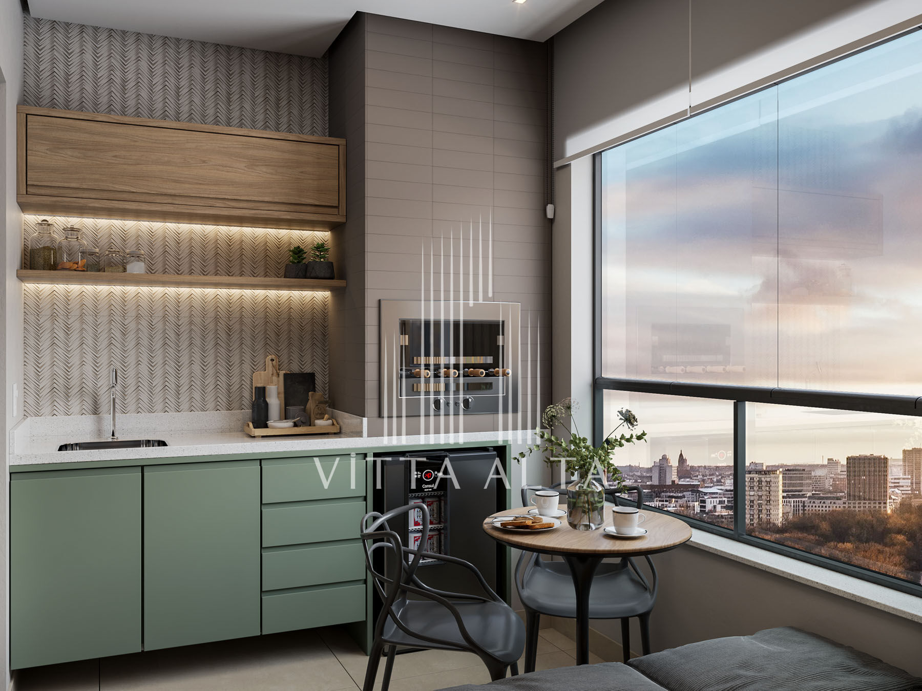 Ideal para momentos de lazer e refeições descontraídas, a varanda gourmet possui piso em porcelanato 60x60cm e paredes com textura acrílica, conferindo modernidade ao ambiente. A integração com a sala reforça o conceito de amplitude.
