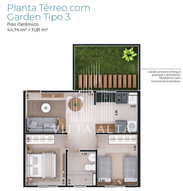 - Garden privativo: 11,81m² (gramado e descoberto)