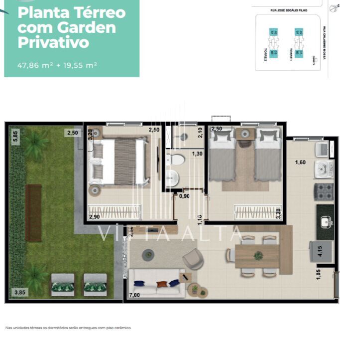 Destaques: Unidade térrea com amplo quintal, dois dormitórios e ventilação natural nos ambientes