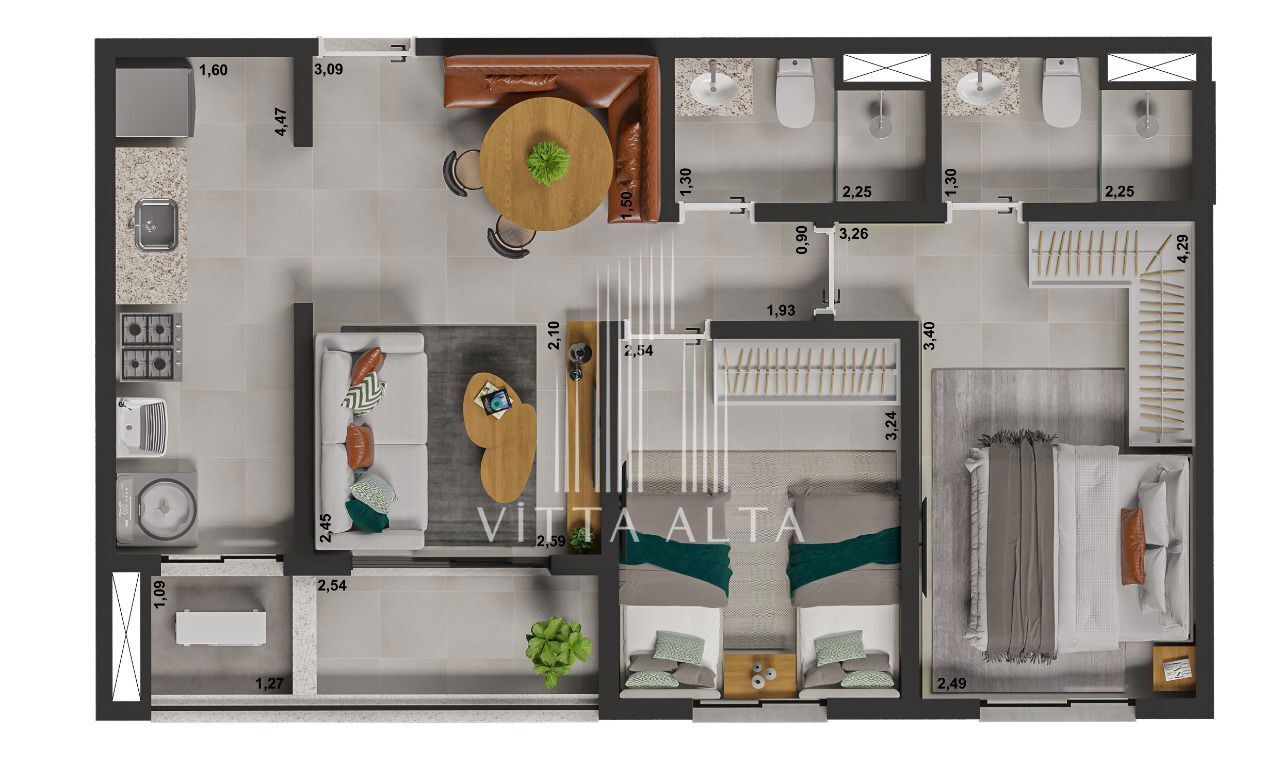 Com 59,95m² de área privativa, este apartamento no condomínio Viven combina funcionalidade e conforto em uma planta inteligente, perfeita para famílias, casais ou investidores. São dois dormitórios, sendo uma suíte, além de uma área social integrada que valoriza a convivência.