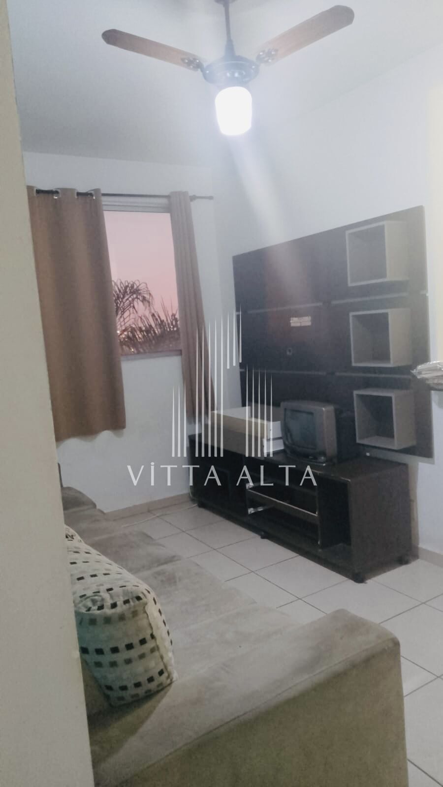 🛋 Sala aconchegante com sofá de 3 lugares, painel de TV, rack, cortina e ventilador de teto.