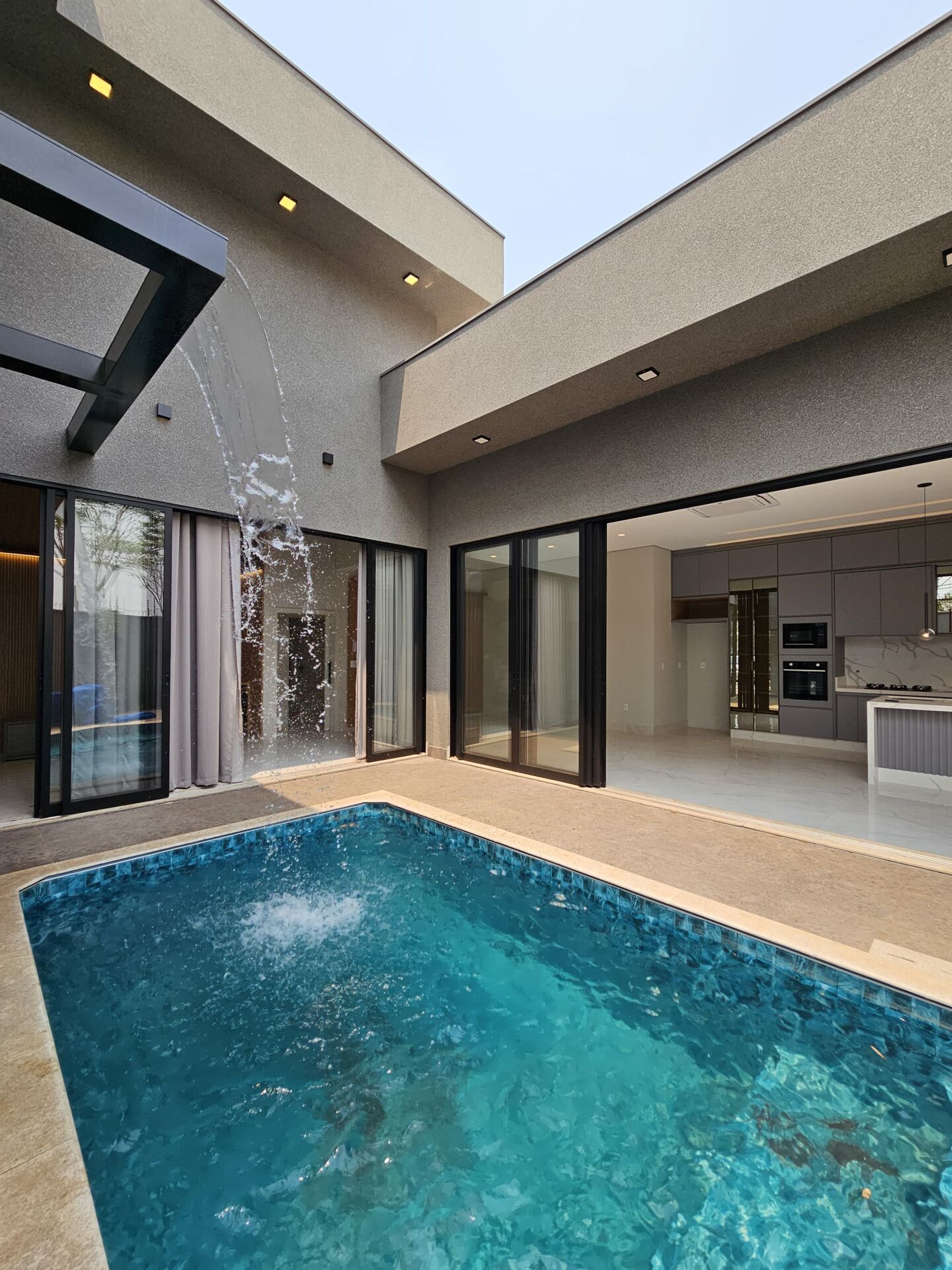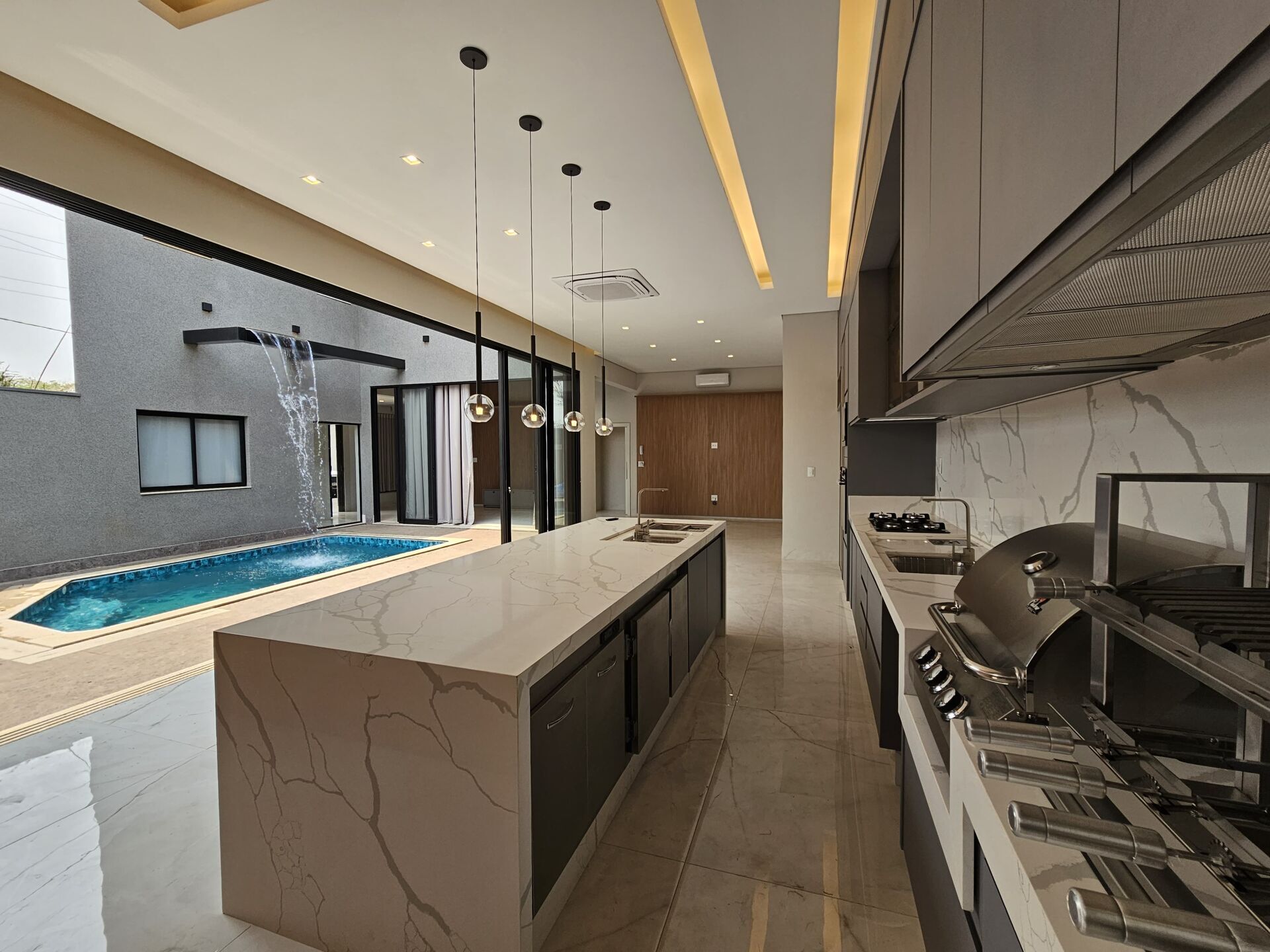 - Espaço social integrado com vista para cascata suspensa e acesso à piscina